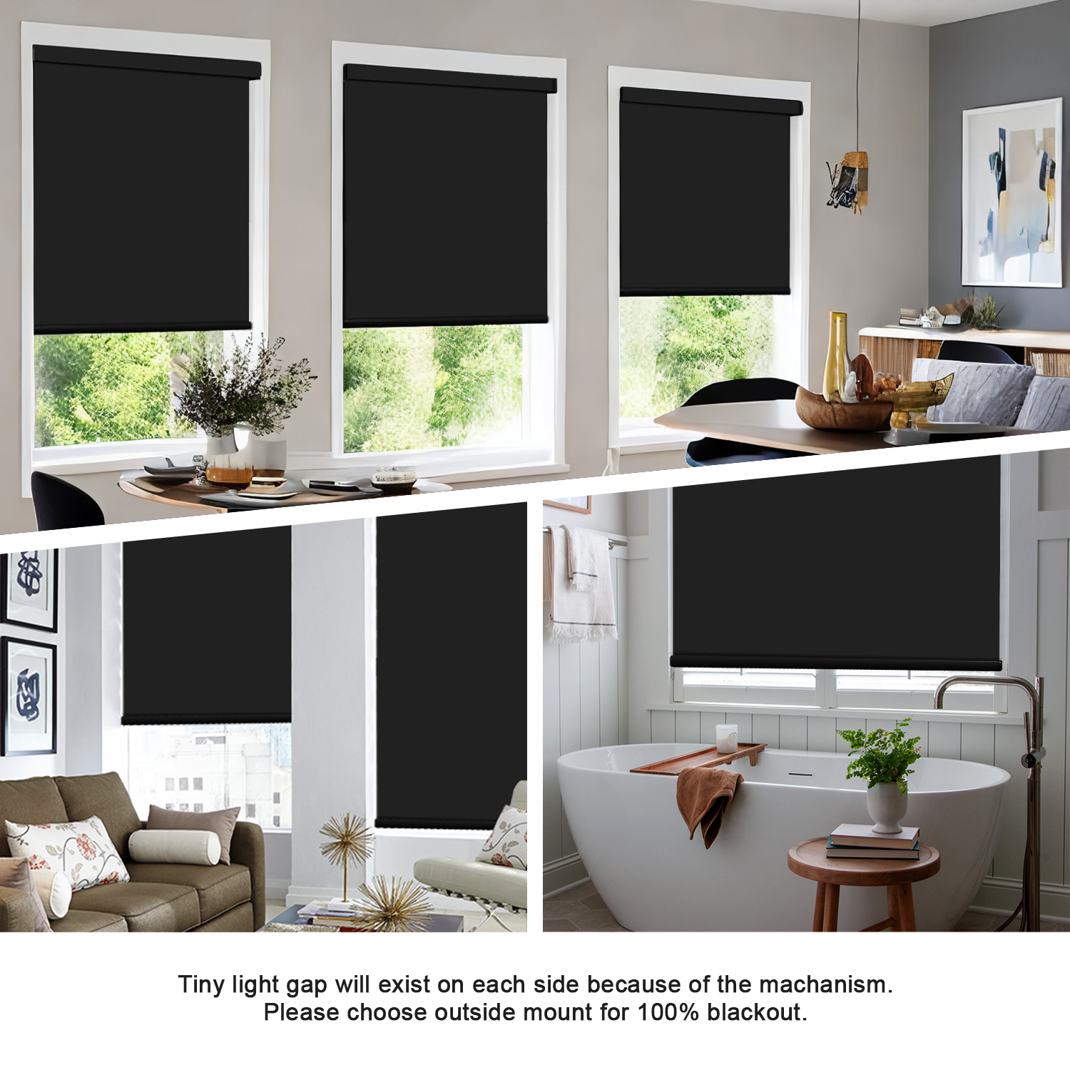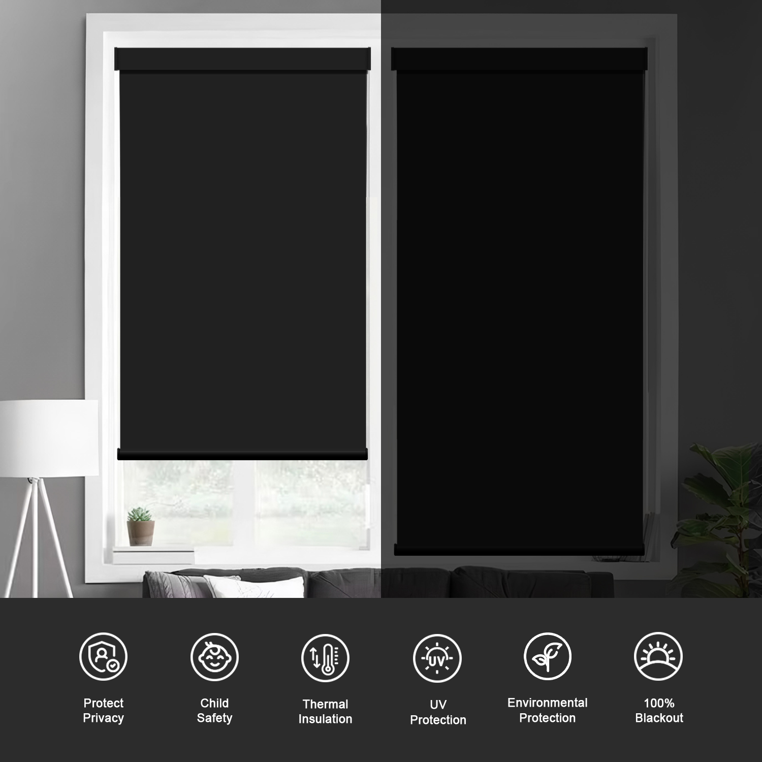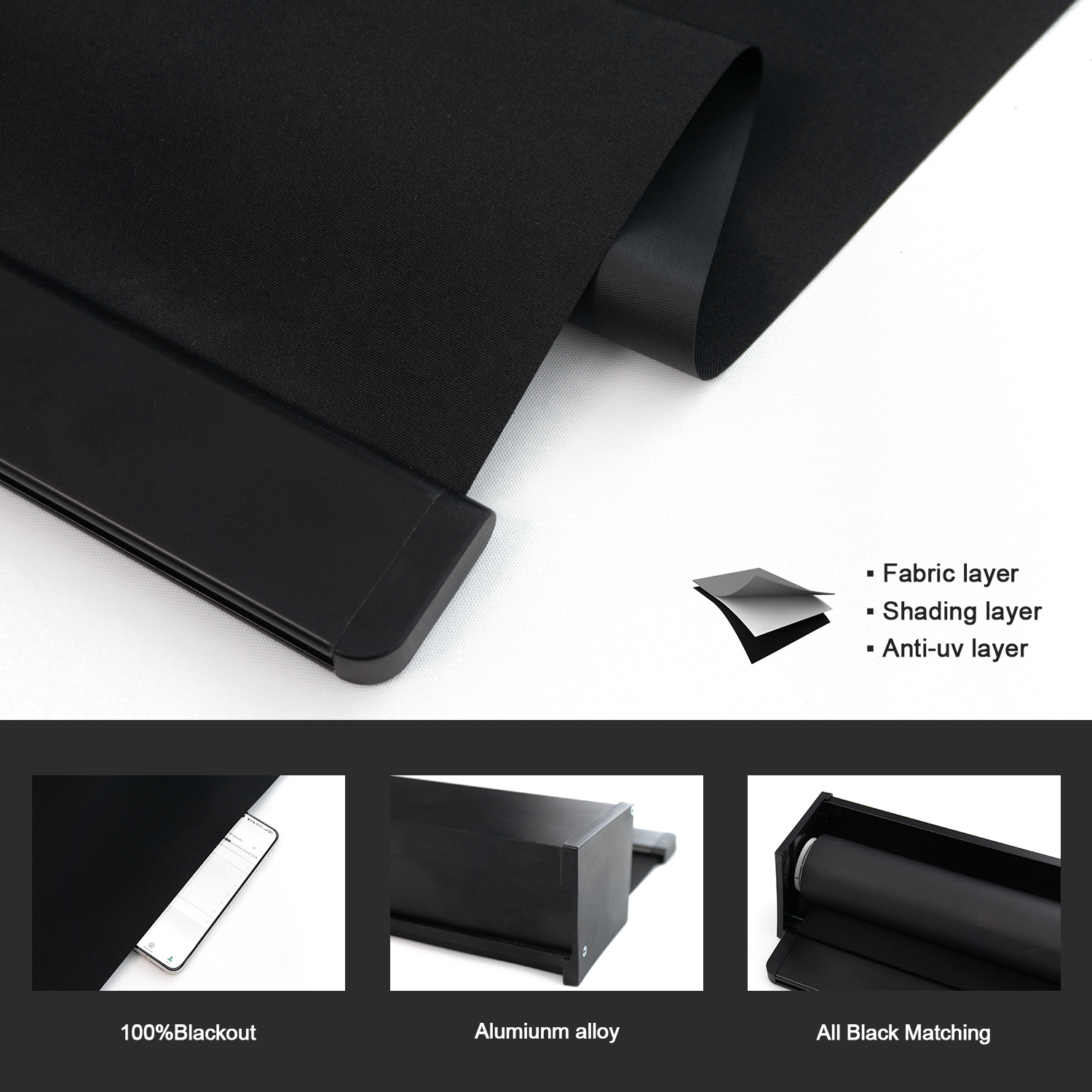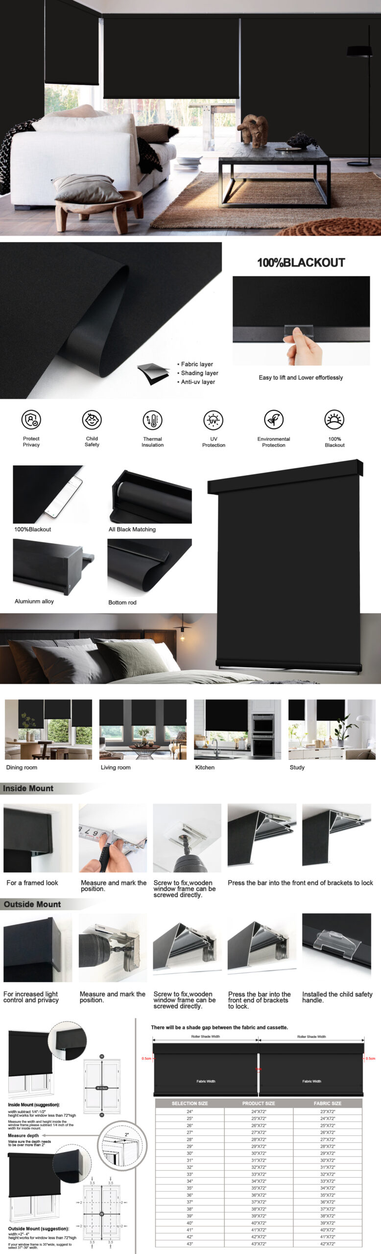 - Fabric Functions: Our roller shades made of 100% blackout 3 pass fabric coated with color backing, it can blocks out 100% sunlight. All black matching, black aluminium cassette and bottom rail