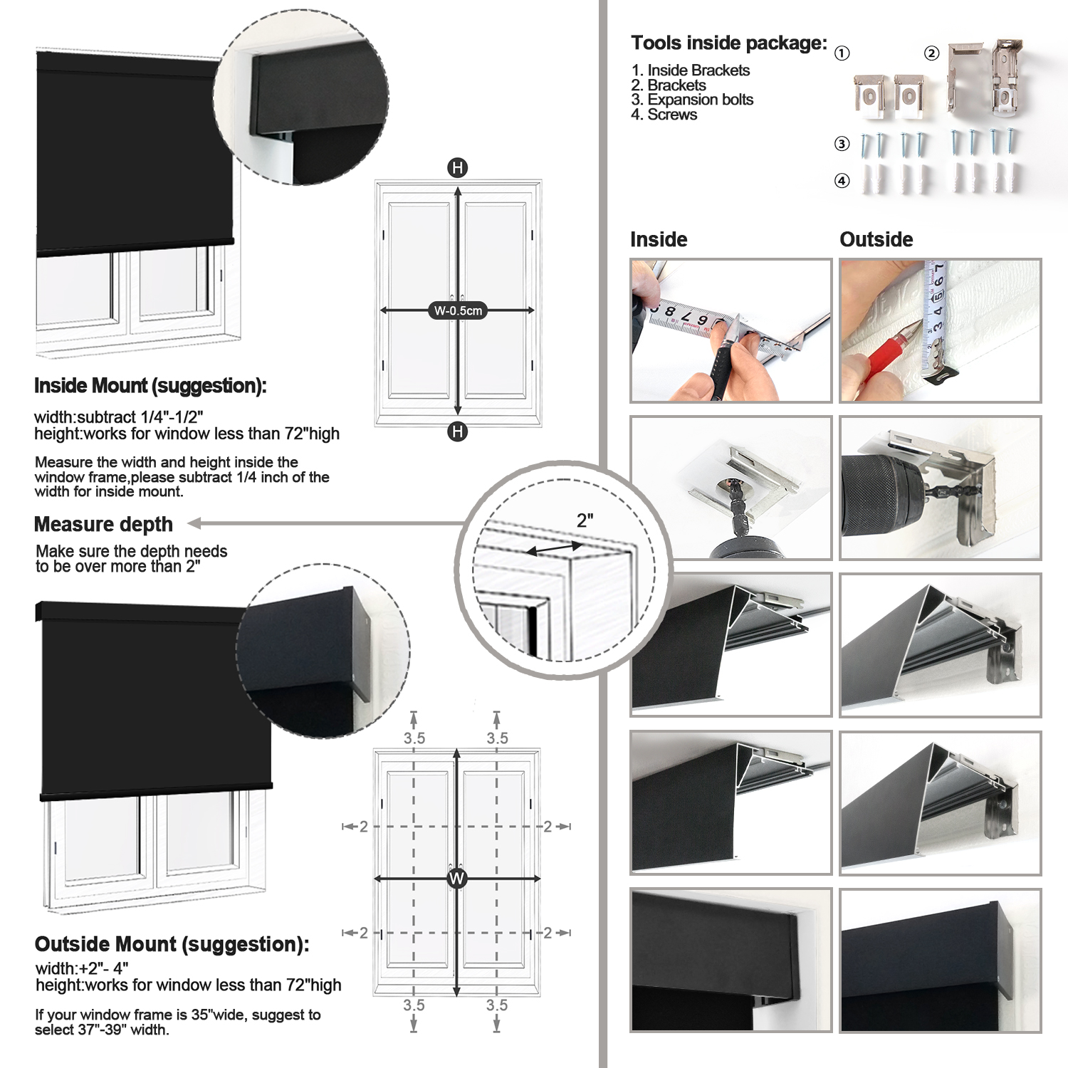 - Order Size:For inside mount, if your window is 34″ width, order a 34″ shade or slightly smaller, window depth >2″. The window shade height can be adjusted from 0″ to 79″.(Please Note):The fabric width will be 1″ narrower than the total shade size.