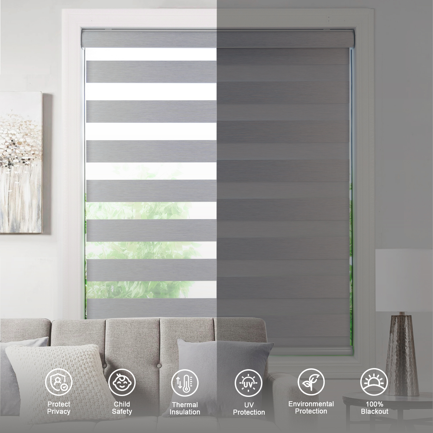 - Fabric Functions: Our zebra roller shades made of 100% polyester fabric, 10cm fabric and 7cm sheer part, blackout fabric can block sunshine and make room darkening