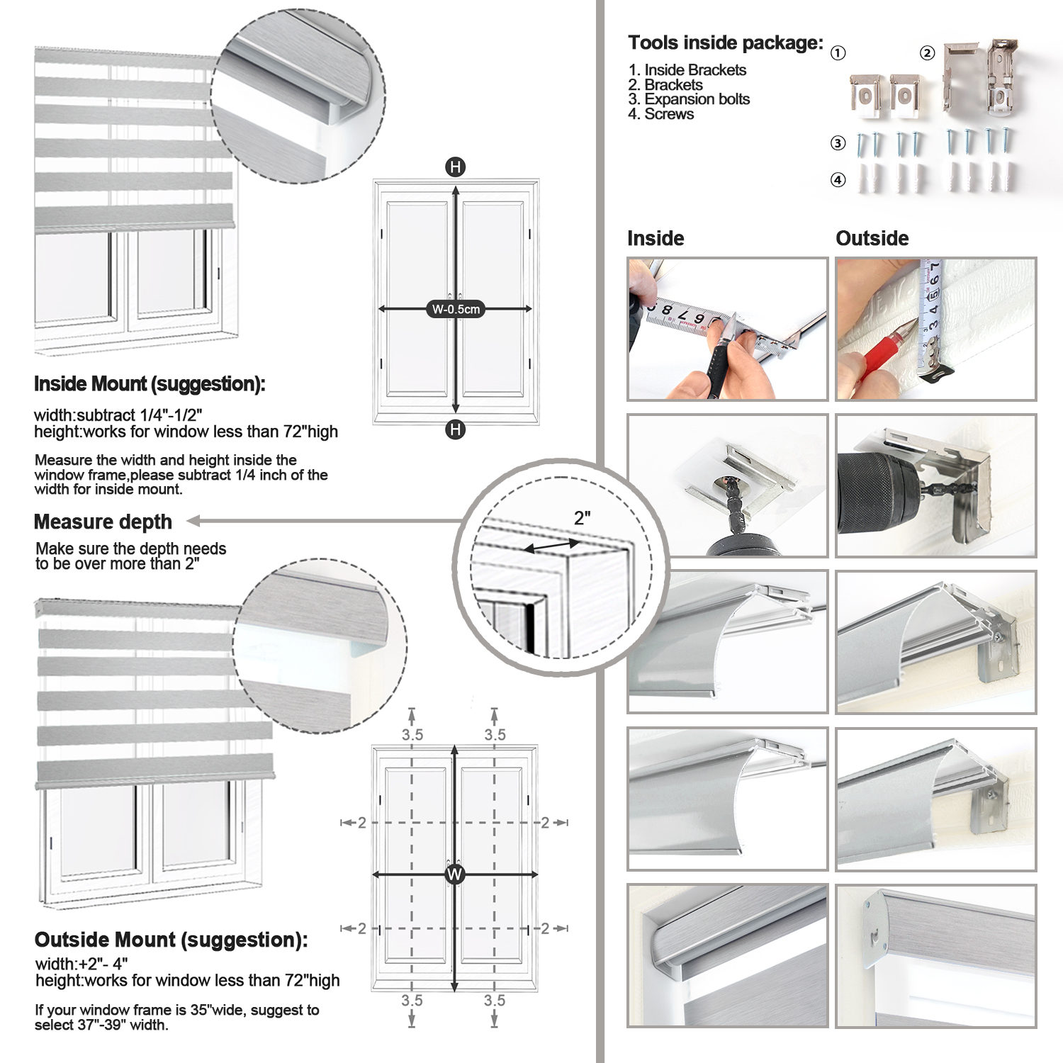 - Order Size:For inside mount, if your window is 34″ width, order a 34″ shade or slightly smaller, window depth >2″. The window shade height can be adjusted from 0″ to 79″.(Please Note):The fabric width will be 1″ narrower than the total shade size.