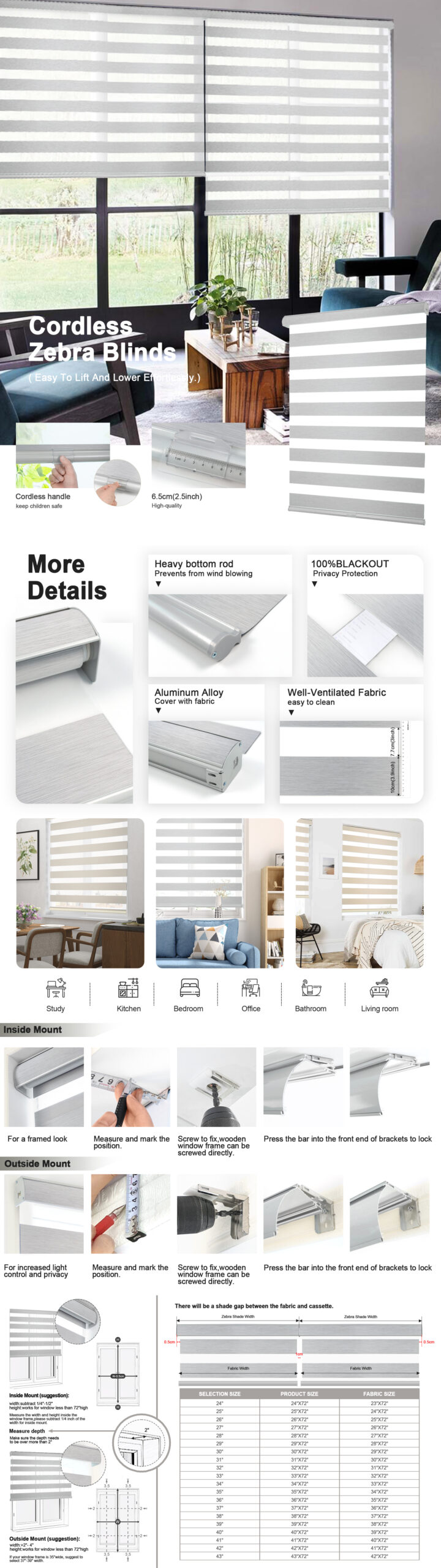 - Cordless Design: The cordless design ensures safety for family and pets, offering greater convenience. The spring system allows smooth stopping at any position.