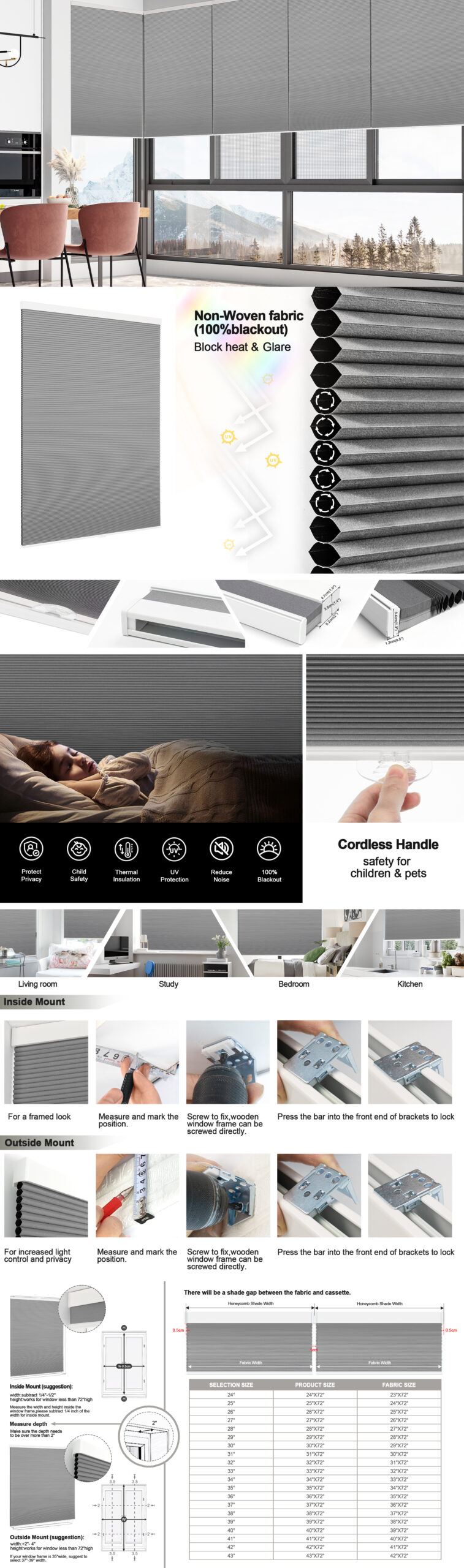 - Fabric Functions: no-woven fabric, make your room dark, and provide complete privacy protection, cellular structure enables air storage in the hollow layer, keeps the room temperature constant, reduces the volume.