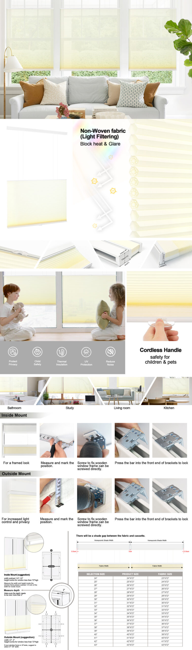 - Order Size:For inside mount, if your window is 34″ width, order a 34″ shade or slightly smaller, window depth >2″. The window shade height can be adjusted from 0″ to 118″.(Please Note):The fabric width will be 0.25″ narrower than the total shade size.