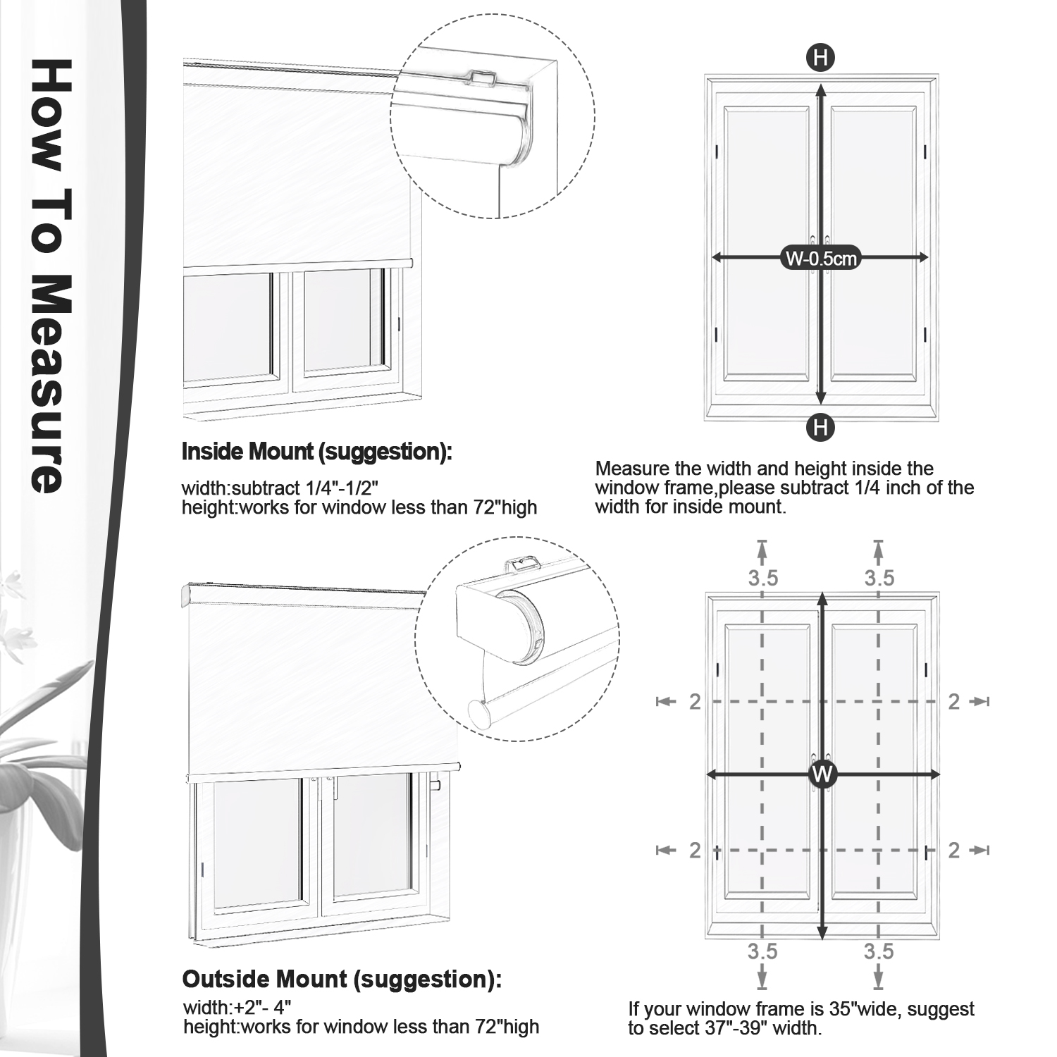 - Order Size:For inside mount, if your window is 34″ width, order a 34″ shade or slightly smaller, window depth >2″. The window shade height can be adjusted from 0″ to 79″.(Please Note):The fabric width will be 1″ narrower than the total shade size.