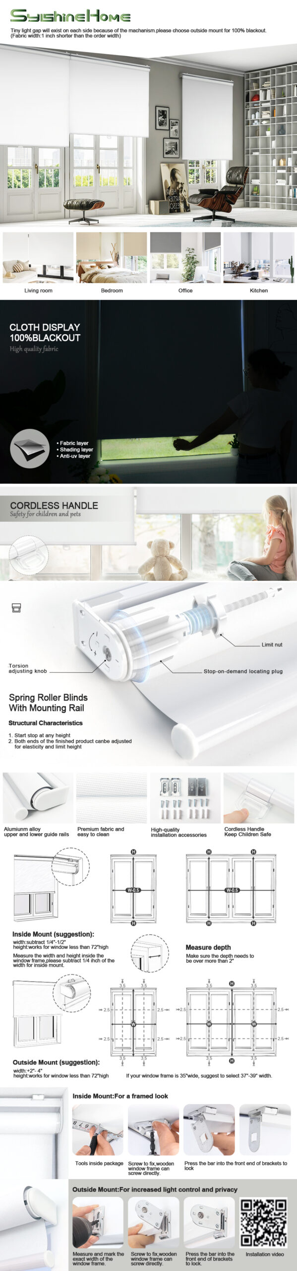 - Cordless Design: The cordless design ensures safety for family and pets, offering greater convenience. The spring system allows smooth stopping at any position.