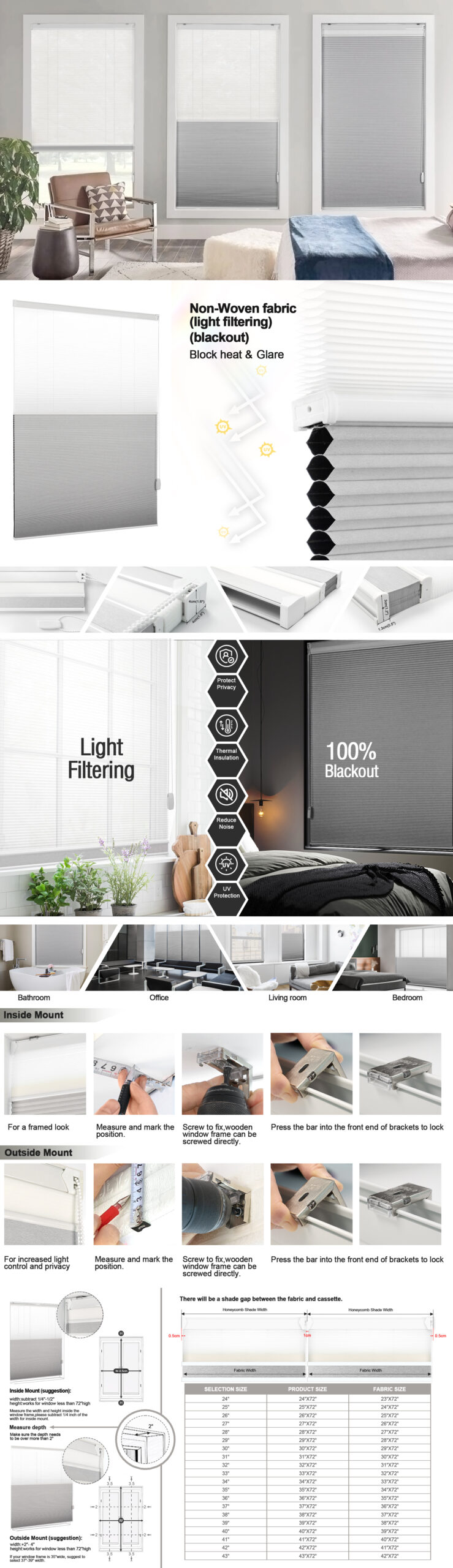- Fabric Functions: blinds made with both sheer part and light filtering no-woven fabric