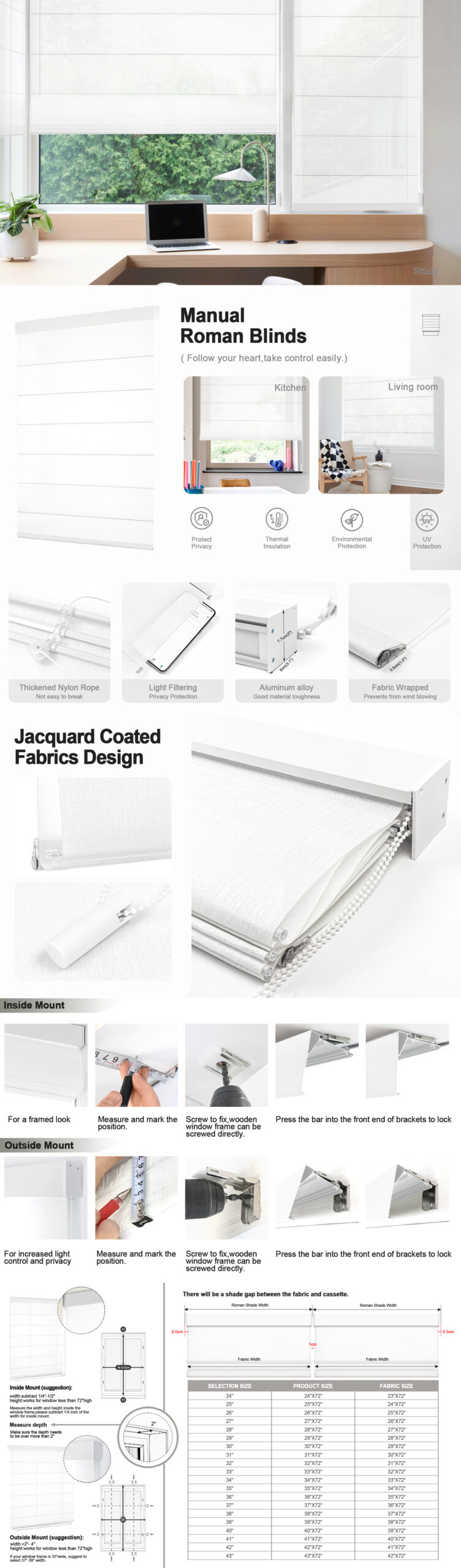 - Order Size:For inside mount, if your window is 34″ width, order a 34″ shade or slightly smaller, window depth >2″. The window shade height can be adjusted from 0″ to 79″.(Please Note):The fabric width will be 1″ narrower than the total shade size.