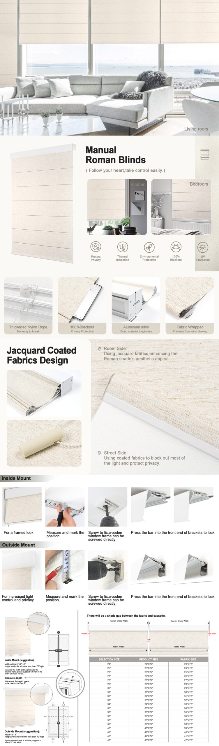 - Order Size:For inside mount, if your window is 34″ width, order a 34″ shade or slightly smaller, window depth >2″. The window shade height can be adjusted from 0″ to 79″.(Please Note):The fabric width will be 1″ narrower than the total shade size.