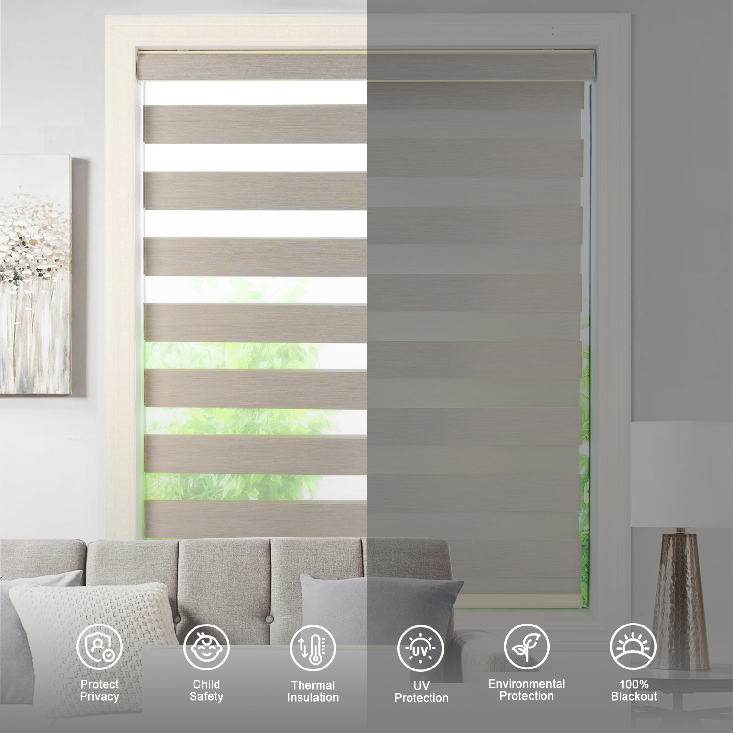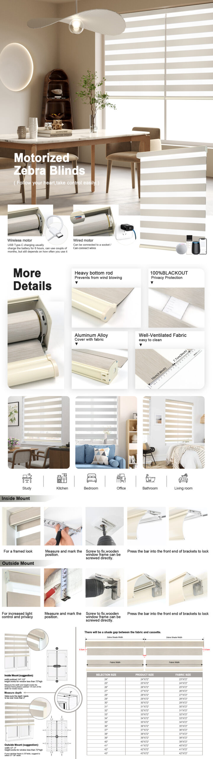 - Fabric Functions: Our zebra roller shades made of 100% polyester fabric, 10cm fabric and 7cm sheer part, blackout fabric can block sunshine and make room darkening