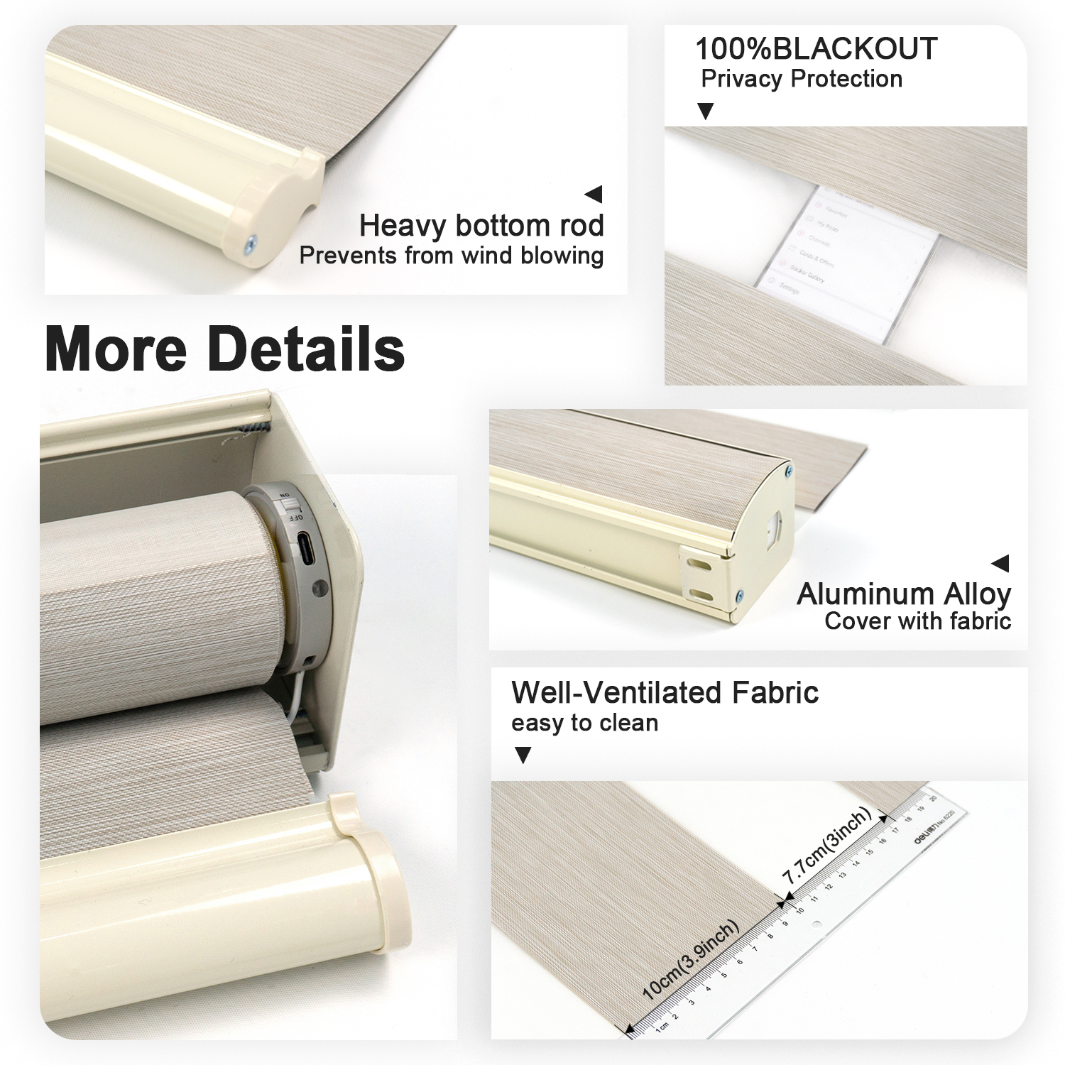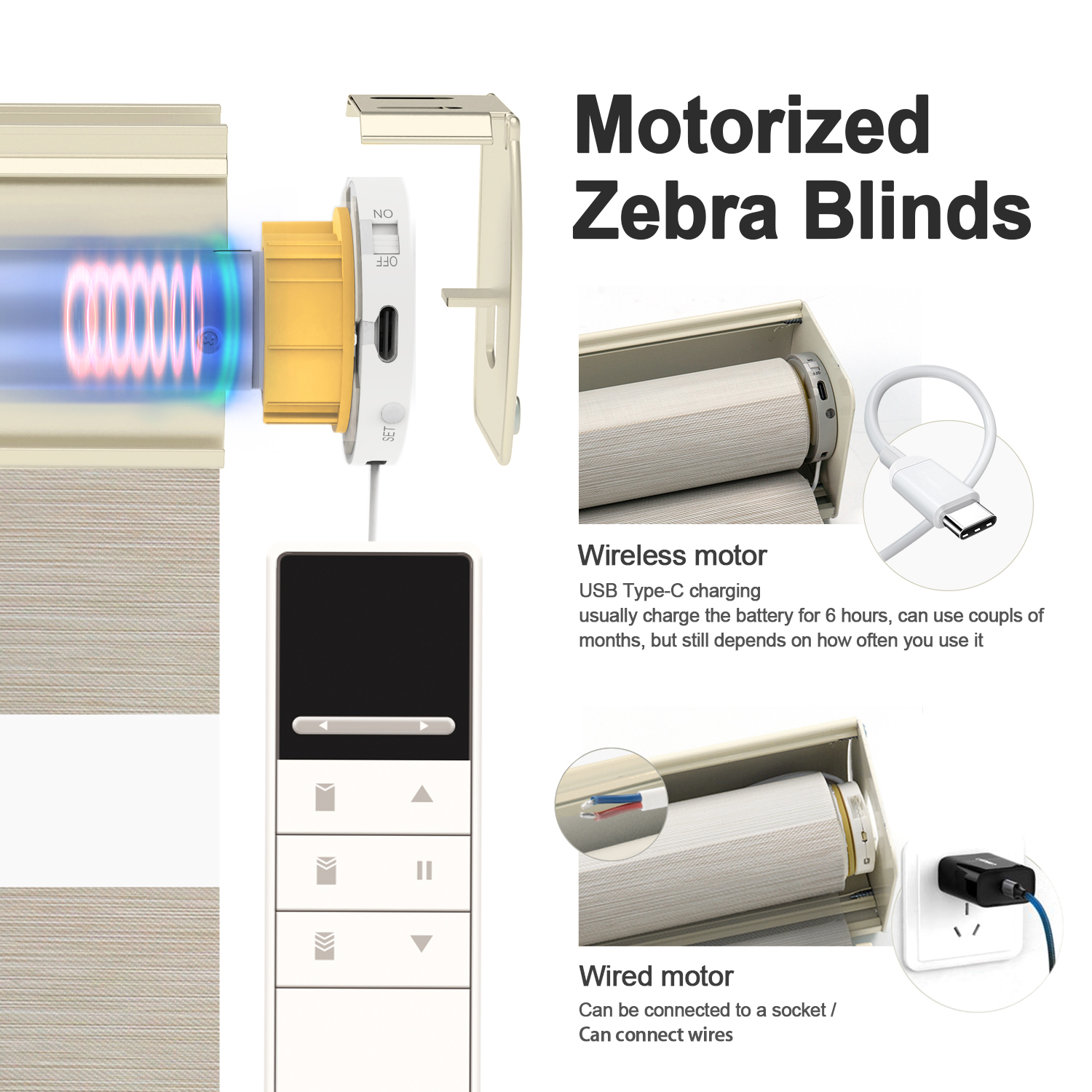 - Motorized: Use rechargeable battery motor, can be controlled by remote or Apps like alexa, google home, homekit.etc. Use USB cable to charge the battery. Charge the battery for 6 hours can use some months.